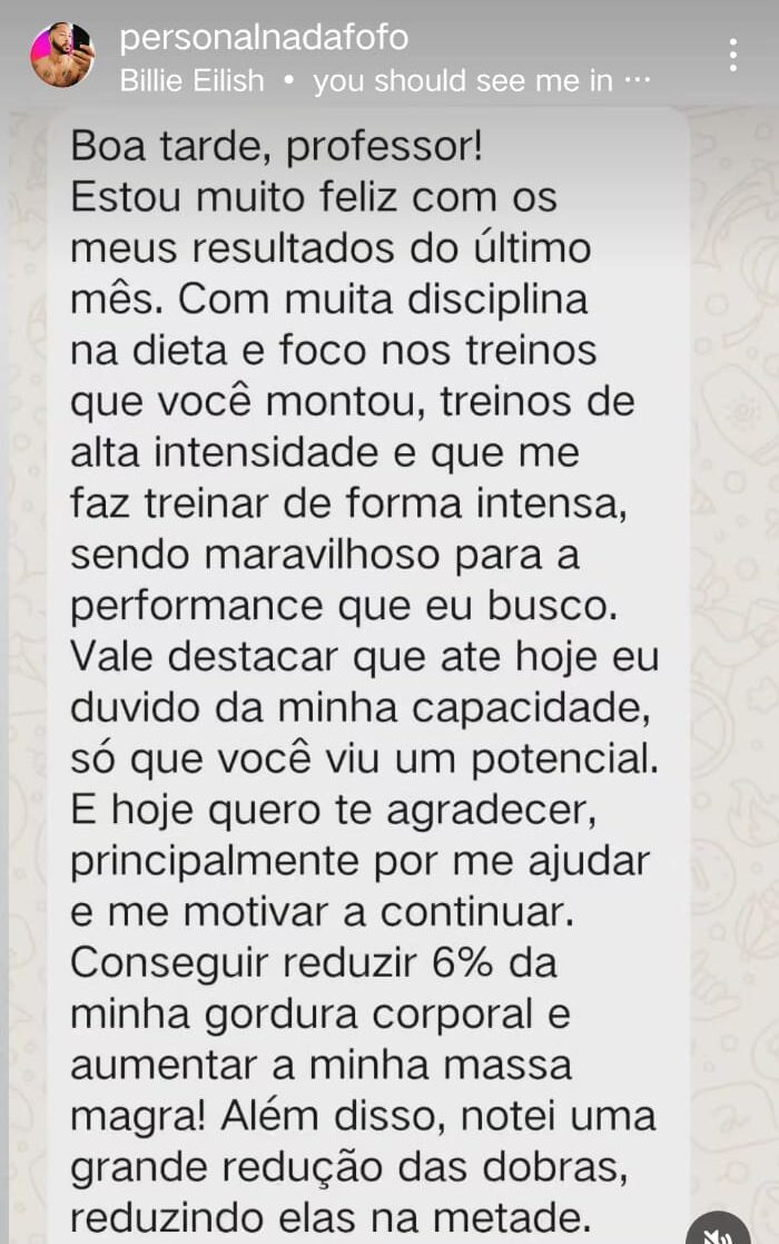 Meu treinamento é baseado em uma abordagem que combina exercícios de alta intensidade e orientações sobre um estilo de vida saudável. Vamos juntos alcançar seus objetivos?!!!
